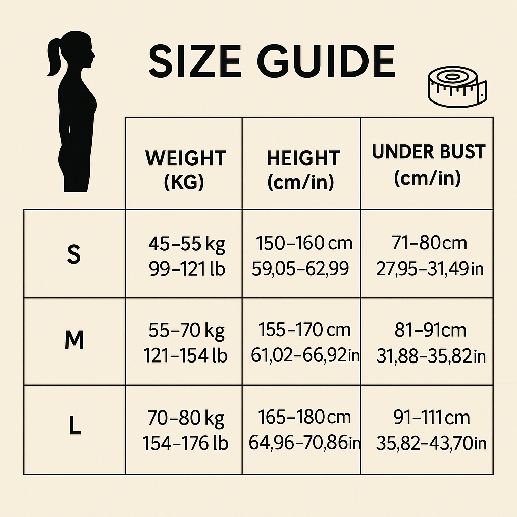 Sizes available: S (45–55 kg), M (55–70 kg), L (70–80 kg)